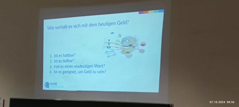 Passend zum Jahrgangsthema „Wertvoll und Kostbar“, besuchte uns Anfang Oktober die OeNB. Die FinanzFit-Workshops brachten den Schüler*innen die Bedeutung des Geldes, den Umgang damit und die Hintergründe des beständigen Wandels der Preise näher. Bei den unterhaltsamen Quizzes am Ende jeder Einheit konnten die Schüler*innen ihr gewonnenes Wissen unter Beweis stellen.